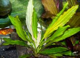 Echinodorus Ludin is one of the large Echinodorus with an original leaf shape. Try to leave the aquarium under incandescent light or sufficiently long natural sunlight. Very prolific and easily produces young plants on the flowering shoot. When the direct rays of the sun hit the plant, it bends as if basking in this lighting, with the planes of its leaves to warm up and bask. 2 - 3 young yellow-pink leaves with rare pink spots along the entire plane gradually turn into light green older ones, followed by darkening to a lush green color. The bush bears about 15 - 25 leaves, unpretentious.[1]
